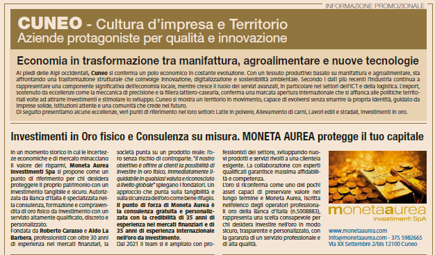 Il Sole 24 Ore presenta alcune eccellenze del territorio, veri punti di riferimento nei loro settori: Moneta Aura Investimenti spa, per gli investimenti nell’oro.